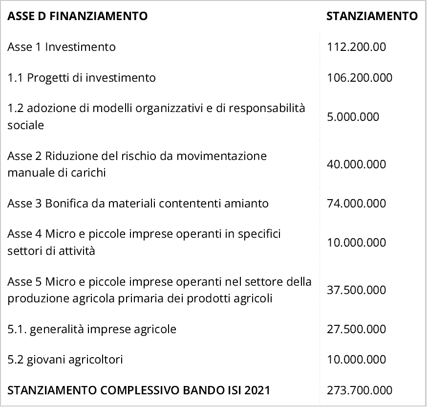 Ancora una volta i progetti delle aziende che richiederanno gli incentivi dovranno essere finalizzati al miglioramento delle condizioni di salute e di sicurezza dei lavoratori ed essere relativi agli ambiti descritti in tabella.