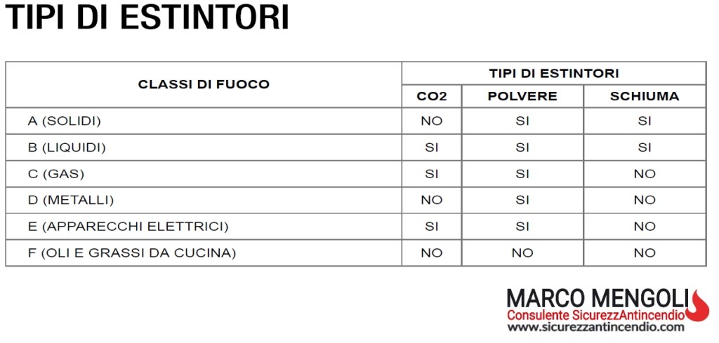 Oggi ti voglio parlare degli estintori a POLVERE, ma come immagino saprai esistono differenti tipi di estintori (vedi tabella sopra) e questo in quanto, in base alla natura dell’incendio è fondamentale scegliere e utilizzare la giusta tipologia, perché alcuni tipi di estintori potrebbero non essere adatti per l’incendio in atto e questo in quanto non supportano la relativa classe di fuoco (vedi tabella sopra) e rivelarsi così completamente inutili per lo spegnimento dell’incendio.