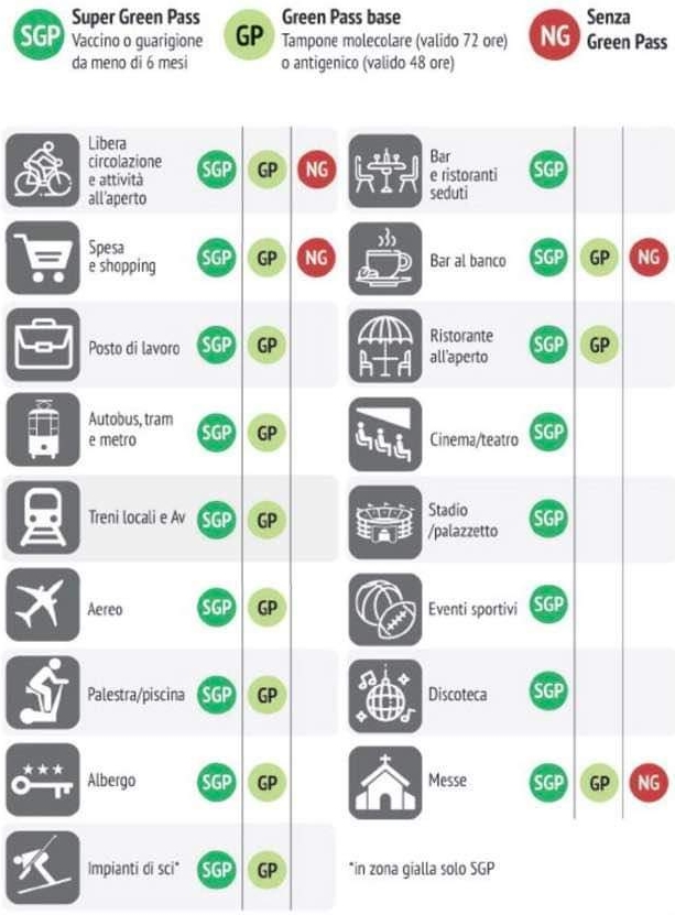 “L’accesso a spettacoli, eventi sportivi, bar e ristoranti al chiuso, feste e discoteche, cerimonie pubbliche è consentito in zona bianca e gialla solo ai possessori del super green pass“