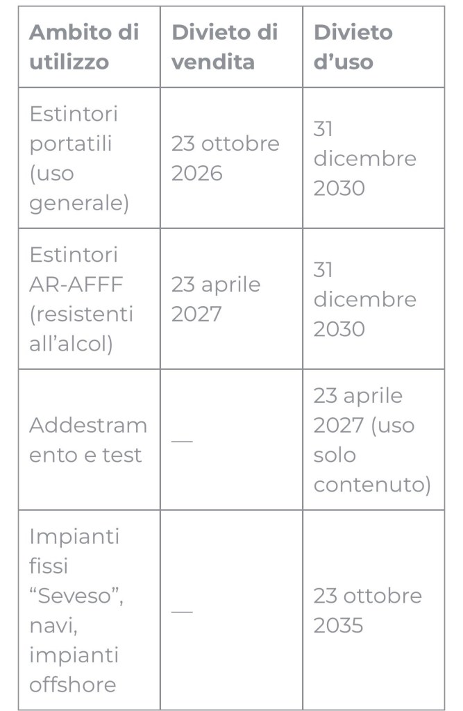 In sostanza come è facilmente intuibile il Regolamento UE 2025/1988 prevede una progressiva eliminazione delle schiume antincendio contenenti PFAS.